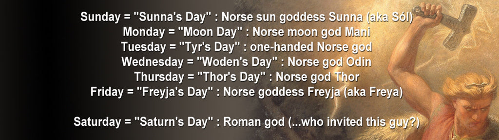 Many people know that our names for the days of the week carry the memories of ancient gods. And while the Romans had their own official names for each day of the week, the gods of Norse mythology have a very strong presence in the day names we use today. For example, Thursday comes from Thursdaeg or Thorsdagr (Old Norse: Þórsdagr), which both mean "Thor's day".