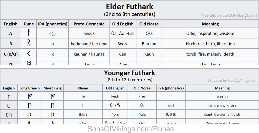 Thanks for visiting our blog! As a thank-you, enjoy 15% off your first order in our online Viking Shop with the discount code BLOG15.NOTE: Full tables of the Elder Futhark and Younger Futhark are available at the bottom of this article. Runes History In Norse lore, the god, Odin, impaled his heart with his own spear and hung on the world tree, Yggdrasil, for nine days and nights all to perceive the meaning of the runes. The runes were symbols that sprang from the Well of Urd – the source of fate. Odin made his sacrifice at great anguish and risk to himself because he knew that the runes conveyed deep meaning, and if he could understand their meaning he would gain profound wisdom and power. So, we see...