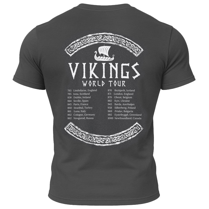 Featuring the "tour" dates of just some of the memorable Viking raids and settlements around the world during the Viking age on the back of the shirt, as well as our Viking ship logo on the front.
